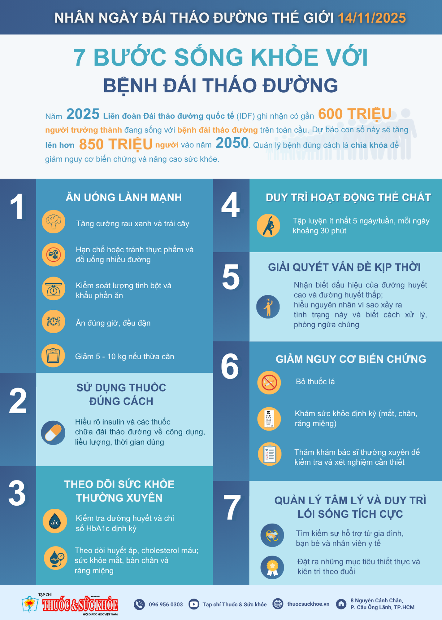 Năm 2025, Liên đoàn Đái tháo đường Quốc tế (IDF) ghi nhận có gần 600 triệu người trưởng thành đang sống với bệnh đái tháo đường trên toàn cầu. Dự báo con số này sẽ tăng lên hơn 850 triệu người vào năm 2050. Quản lý bệnh đúng cách là chìa khóa để giảm nguy cơ biến chứng và nâng cao sức khỏe.