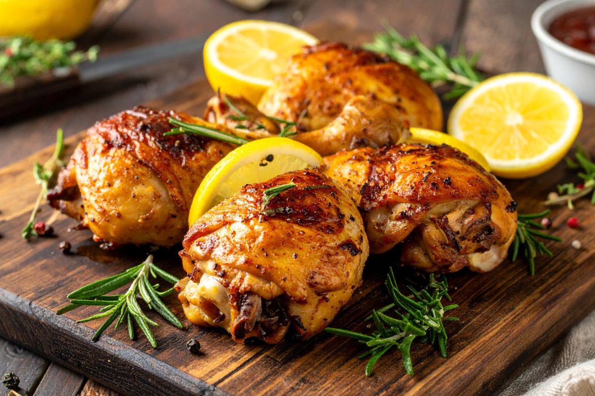 Dùng gà nướng thay vì chiên rán để giữ trọn dưỡng chất và hạn chế cholesterol xấu. Ảnh: Canva.