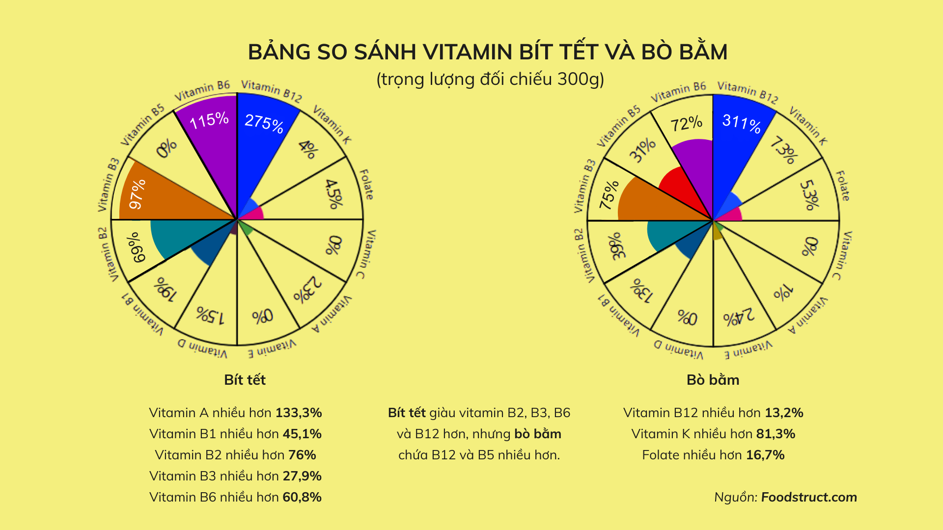 Bảng so sánh vitamin giữa bít tết và bò bằm. Ảnh: Foodstruct