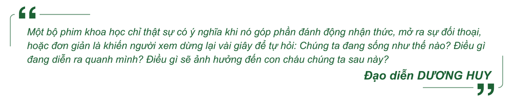 ĐD Dương Huy: Đúng, nếu không đam mê chắc tôi không theo đuổi con đường này suốt 15 năm qua. Tôi có thói quen đi ra ngoài, lắng nghe những chia sẻ và nhu cầu của người dân, rồi kể lại chúng bằng ngôn ngữ điện ảnh. Thật tình thì làm phim khoa học không mong nổi tiếng, đặc biệt ở nước ta, khi người dân chưa ủng hộ phim khoa học như người dân các nước phát triển. Làm phim khoa học cũng không mong có nhiều tiền. Nhiều lúc chúng tôi phải bỏ tiền túi để có được những cảnh quay giá trị nhằm giúp người xem hiểu rõ hơn vấn đề mình đang muốn chuyển tải.