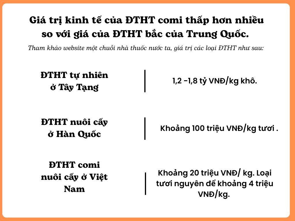 Giá trị y học của ‘ĐTHT comi’ thấp hơn so với ĐTHT bắc. ĐTHT comi cũng có các tác dụng chống ung thư, chống oxy hóa, điều hòa hoạt động miễn dịch, kháng khuẩn, kháng nấm, chống viêm nhiễm, tăng khả năng phục hồi các tổn thương gan, tăng số lượng tinh trùng. Giá trị dinh dưỡng và hoạt tính sinh học của ĐTHT comi chỉ bằng 75-80% ĐTHT bắc từ tự nhiên.