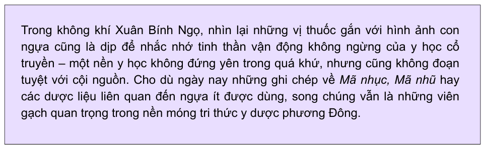 Ít ai biết rằng bên cạnh vai trò là loài vật gắn bó mật thiết với đời - sống lao động và quân sự, ngựa còn để lại dấu ấn riêng trong kho tàng y học cổ truyền. Dù số lượng vị thuốc có nguồn gốc từ ngựa không nhiều và ngày nay ít được sử dụng, nhưng những ghi chép về chúng vẫn phán ảnh rõ tư duy quan sát tinh tế, cách quy nạp kinh nghiệm và hệ thống hóa tri thức y học của người xưa.