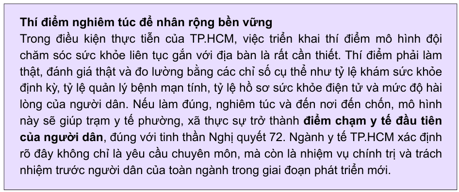 Thời gian qua, TP.HCM đã sắp xếp, cấu trúc lại các trạm y tế phường, xã theo hướng trở thành đơn vị sự nghiệp công lập hoàn chỉnh, trực thuộc UBND phường, xã, phù hợp với mô hình chính quyền địa phương hai cấp. Đây là bước đi cần thiết để đưa y tế cơ sở gần dân hơn, gắn với chính quyền cơ sở và phục vụ người dân tốt hơn.