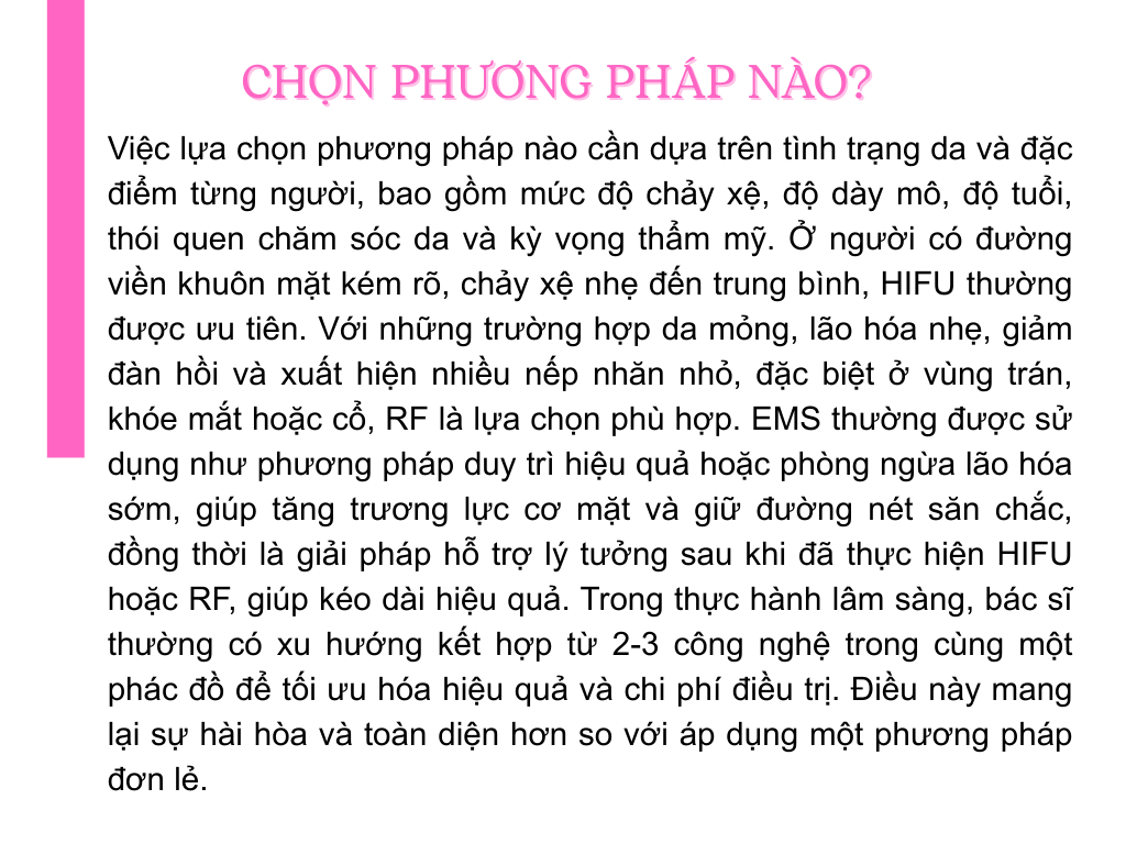 Trong điều trị, EMS mang lại cảm giác thư giãn, dễ chịu, có thể áp dụng định kỳ nhiều lần, đồng thời an toàn và thân thiện với hầu hết loại da. EMS thường được sử dụng như liệu trình hỗ trợ duy trì sau HIFU hoặc RF để kéo dài hiệu quả. Tuy nhiên, EMS tác động chủ yếu lên các nhóm cơ nông, không trực tiếp kích thích tái tạo collagen và không xử lý được tình trạng chảy xệ mức trung bình đến nặng. Trong thực tế, EMS mang tính duy trì và cần thực hiện thường xuyên. EMS phù hợp với người tương đối trẻ, có dấu hiệu lão hóa nhẹ hoặc có nhu cầu phòng ngừa chảy xệ.